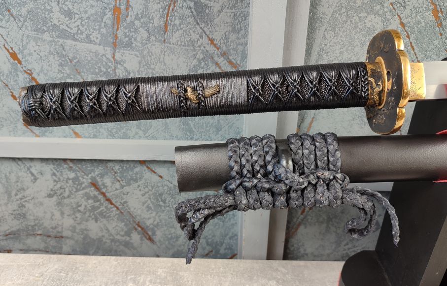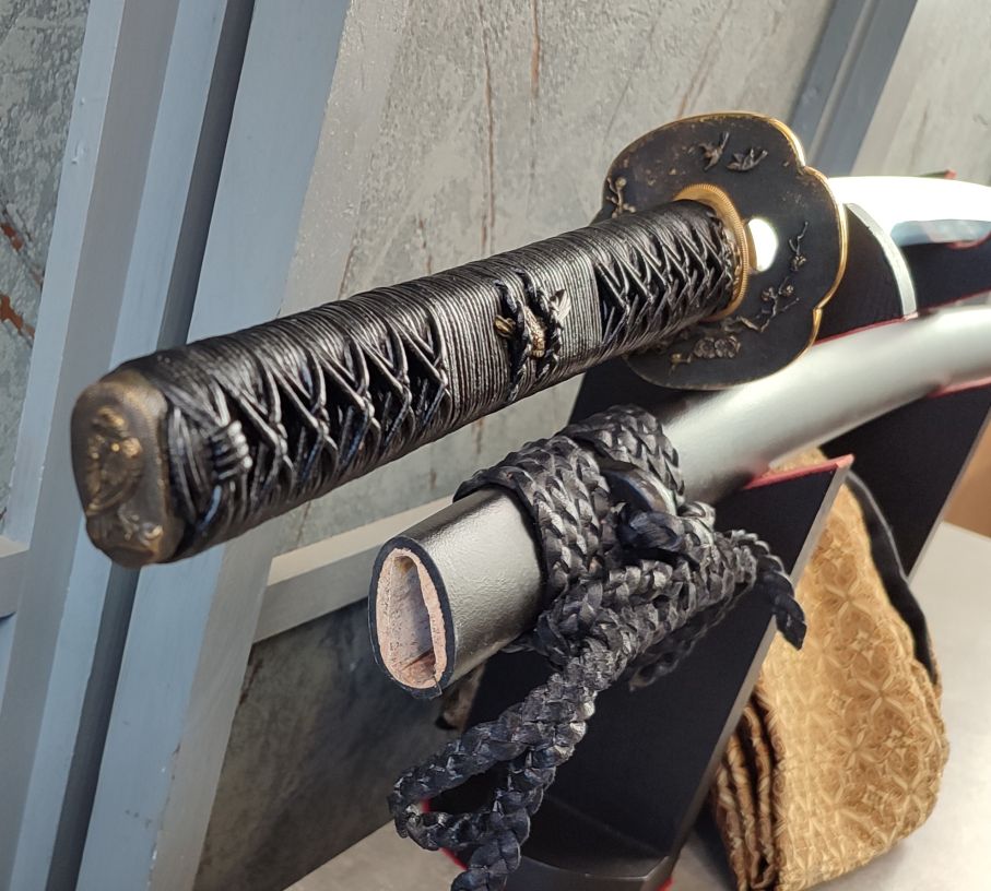 Tsuka: Dřevěná rukojeť byla z obou stran potažena černě lakovanou kůží z Rejnoka a opletena černými, koženými šňůrami s následným prolakováním, pro zajištění pevnosti opletu. Fuchi kashira a jsou stejně jako tsuba z masivní mosazi, s detailním vyobrazením dravce na kashiře a větví borovice na fuchi. Menuki po stranách tsuky jsou odlity do tvaru ptáků s roztaženými křídly. Čepel je v rukojeti zajištěna jedním bambusovým mekugi, jako tomu bylo u původních samurajských mečů.