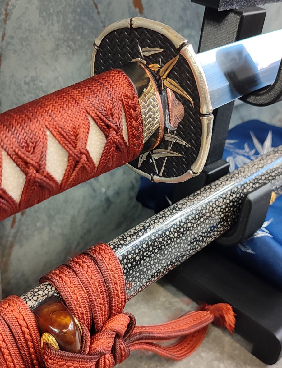 Tsuba: Záštita meče je odlita z mosazi, s vyobrazením bambusových větviček, zvýrazněných mosazí a niklem. Habaki je masivní dvojitý odlitek z kombinace mosazi a mědi, zdobený pilováním. Skvěle konstrastuje s dvojitými, měděnými seppami.