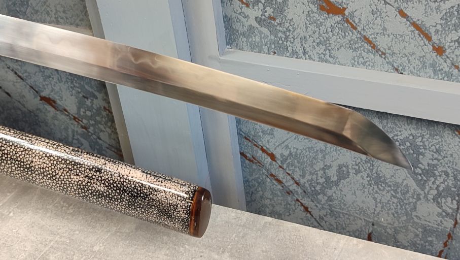 Saya: Pochva je celkově velmi výrazná a zdobná, díky jejímu potažení rejnočí kůží. Koiguchi, kojiri a kurigata jsou tvořeny buvolím rohem. Skvělým doplňkem ladícím s opletem rukojeti, je pak sageo z umělého hedvábí, v kombinaci barev zlatohnědé a černé, která je uvázána v klasickém stylu. Sageo byla upletena z Japonského hedvábí, ve stylu Nakafuji. Na saya je umístěn také zdobený Kaerizuno, proti nechtěnému vytažení pochvy z poza pásu obi.