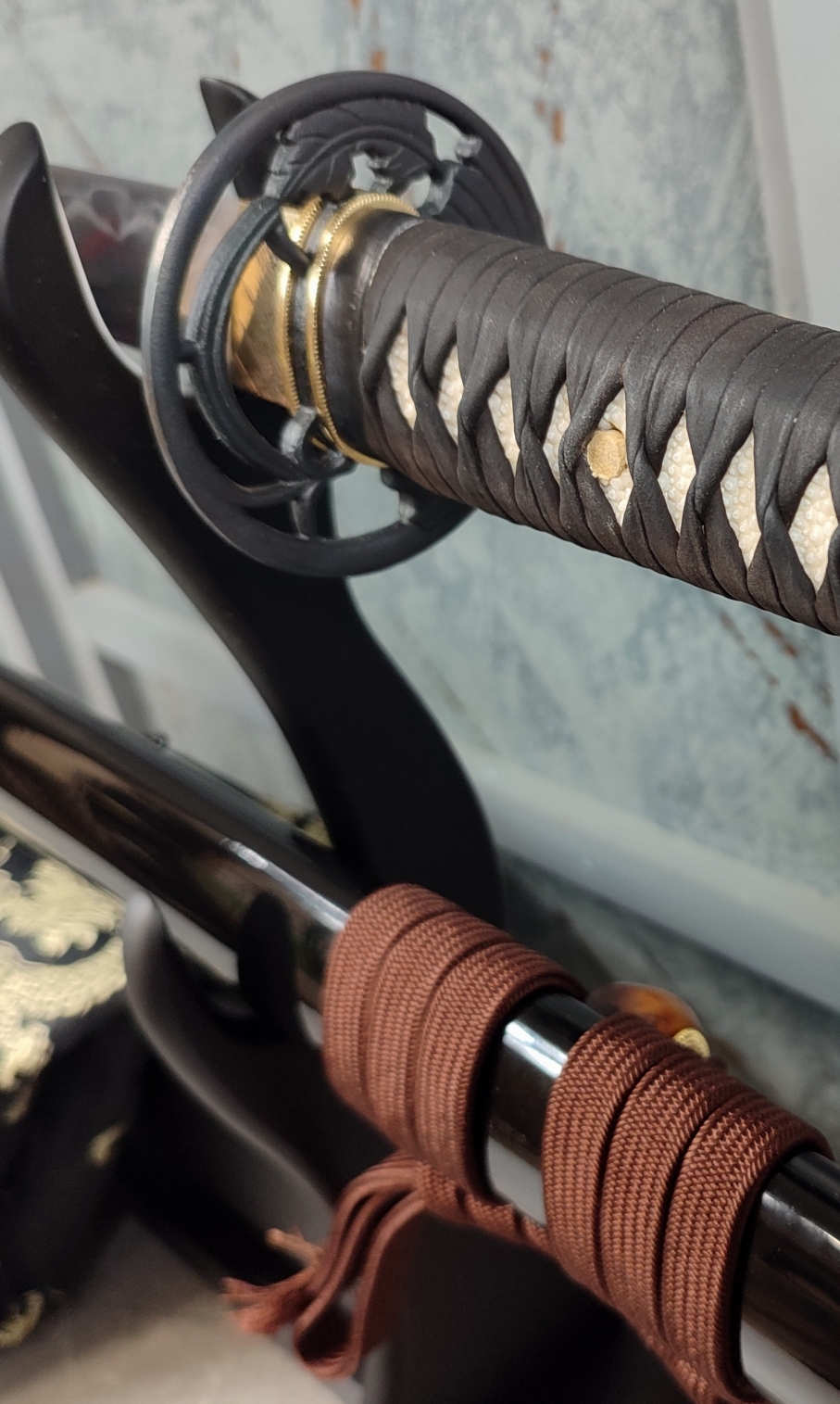 Tsuka: Rukojeť meče byla vyřezána ze dřeva a po stranách potažena rejnočí kůží. Poté byla opletena hnědou, koženou šňůrou ve stylu kumiagemaki a následně několikrát přelakována pro maximální pevnost a trvanlivost opletu při použití v praxi. Fuchi a kashira jsou opět ocelové odlitky v jednoduchém provedení. Menuki jsou mosazné odlitky, znázorňující draky. Čepel je v rukojeti zajištěna jedním bambusovým mekugi.
