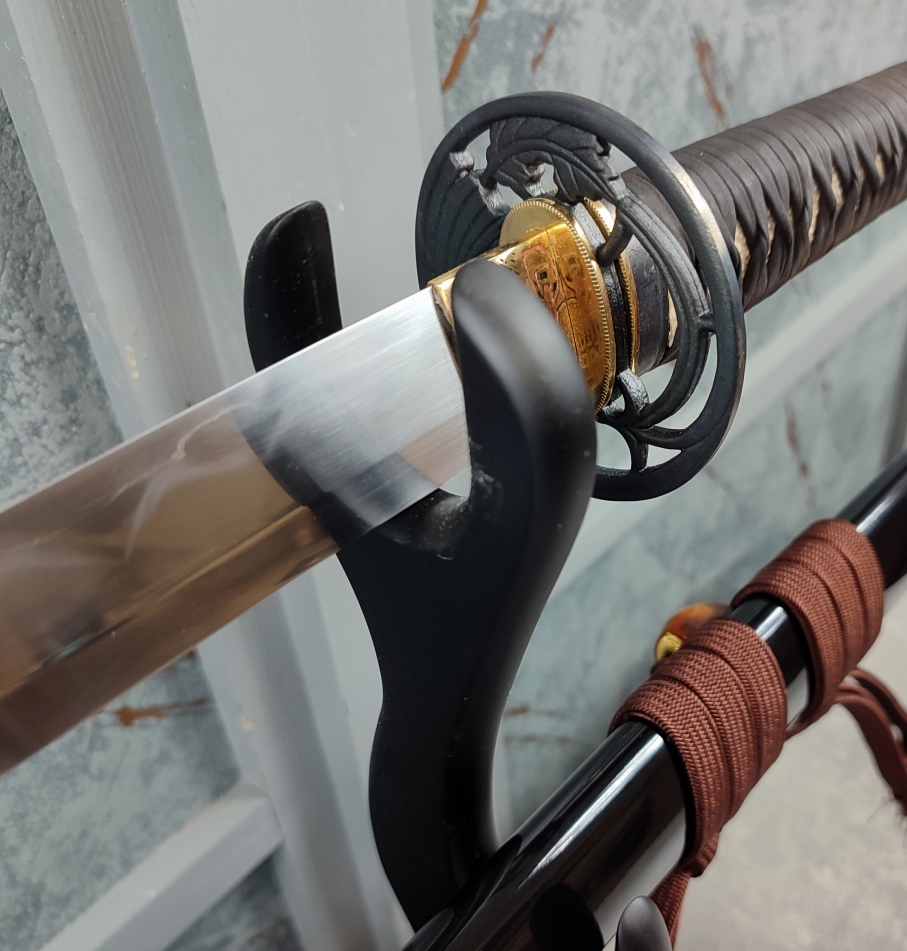 Tsuba: Masivní, kruhová záštita z černě lakované oceli ve stylu sukashi, má tvar stočeného listu v kruhu. Seppy jsou vyrobeny z mosazi, stejně jako jednoduché habaki.