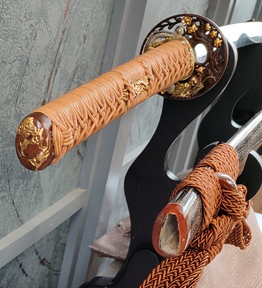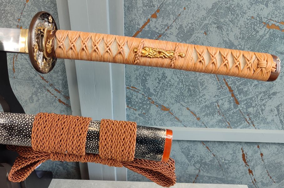 Tsuka: Rukojeť meče byla vyřezána ze dřeva a po stranách potažena rejnočí kůží. Poté byla opletena tenkými, koženými šňůrami ve stylu katatemaki a následně prolakovaná pro maximální pevnost a trvanlivost opletu při použití v praxi. Fuchi a kashira jsou opět mosazné odlitky s vyobrazením draků. Menuki jsou odlity z mosazi ve tvaru draků. Čepel je v rukojeti zajištěna jedním bambusovým mekugi.