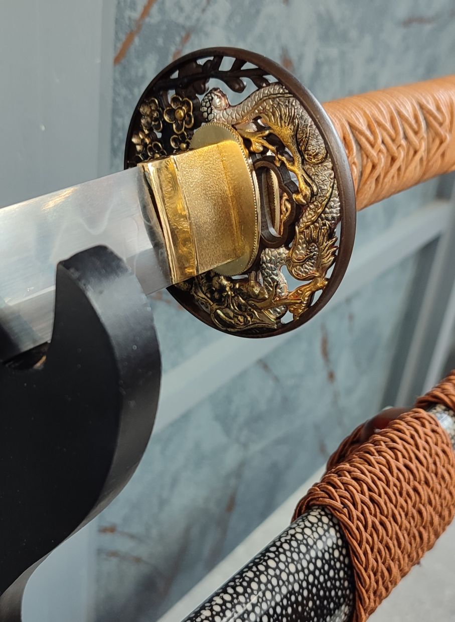 Tsuba: Záštita je odlita z poměděné mosazi s vyobrazením draka a sakurových květů. Vybrané prvky byly zvýrazněny zlatouz a stříbrnou barvou. Seppy jsou měděné. Habaki je masivní mosazný odlitek s hrubým povrchem.