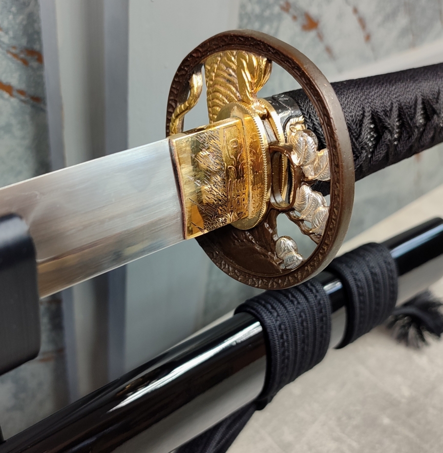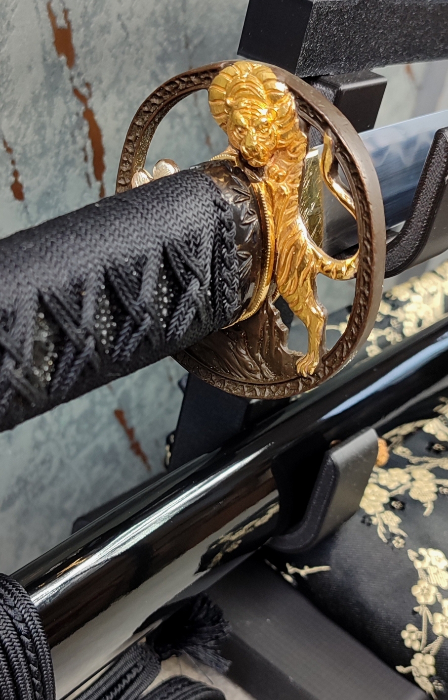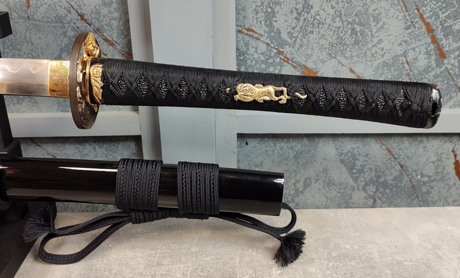 Tsuba: Kruhová tsuba ve stylu sukashi byla odlita z mosazi, s vyobrazením číhajícího tygra, přičemž jednotlivé části tsuby byly zvýrazněny zlatou a stříbrnou. Ozdobný habaki je odlit z jednoho kusu mosazi. Seppy jsou taktéž mosazné.