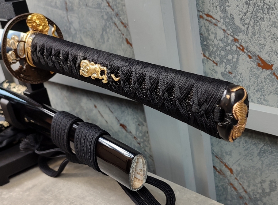 Tsuka: Rukojeť byla potažena černě lakovanou rejnočí kůží, a opletena ito z Japonského hedvábí od Namikawa Heibei, ve stylu jabaramaki. Mosazné menuki ve tvaru tigrů, ve zlaté barvě, jsou umístěny po stranách tsuky. Fuchi a Kashira jsou ze stejného materiálu a ve stejném provedení jako tsuba s vyobrazením zlatých tygrů. Čepel meče je v rukojeti zajištěna jedním bambusovým mekugi.