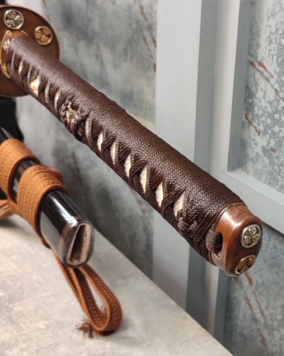 Tsuka: Rukojeť byla po stranách potažena same a opletena jabaraito z Japonského hedvábí od Namikawa Heibei. Následně byl oplet prolakován za účelem jeho zpevnění a zvýšení použitelnosti v praxi. Fuchi, Kashira a Menuki jsou ze stejného materiálu a ve stejném provedení jako tsuba. Čepel meče je v rukojeti zajištěna jedním bambusovým mekugi.