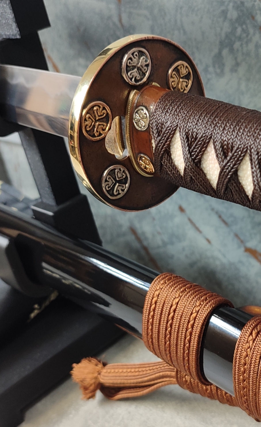 Tsuba: Masivní, kulatá tsuba byla odlita z mosazi a dekorována rodovými znaky rodu Tokugawa, které byly zvýrazněny zlatou a stříbrnou barvou. Po obvodu byla vyleštěna, aby tak dokonale ladila se stejně vyleštěnými mosaznými seppami a habaki.