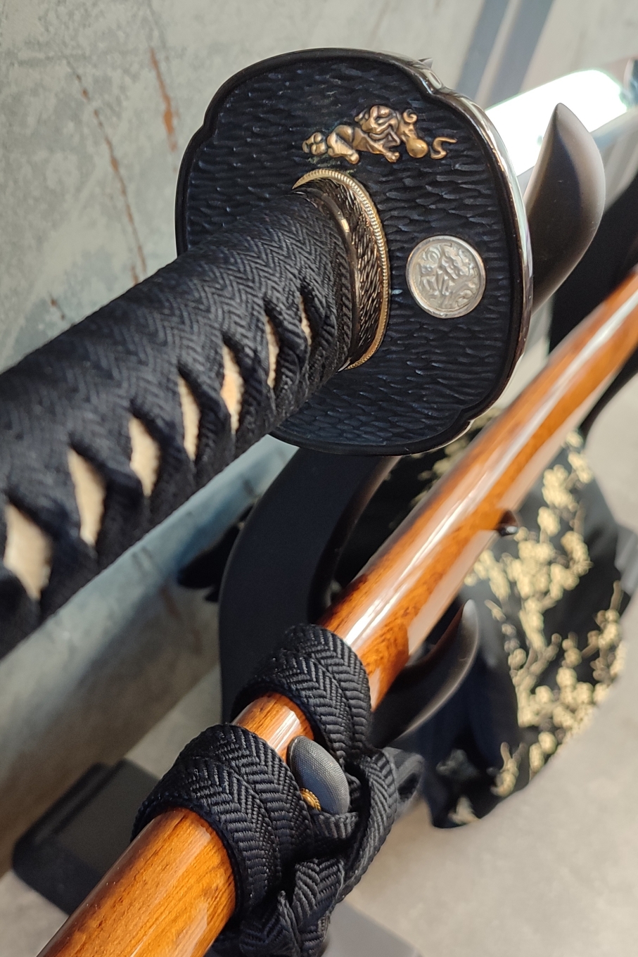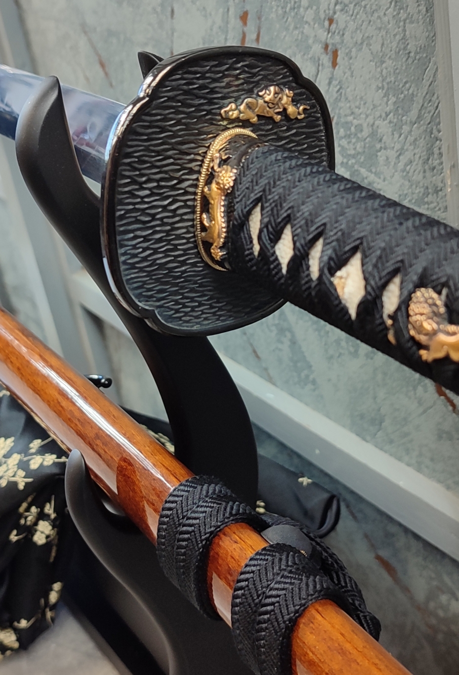 Tsuba: Masivní záštita ve tvaru mokko (čtyřlístek), s detailním vyobrazením stylyzovaného lva byla odlita z mosazi s následnou povrchovou úpravou černou a stříbrnou barvou. Seppy jsou mosazné. Habaki pak z kombinace mosazi a zinku.