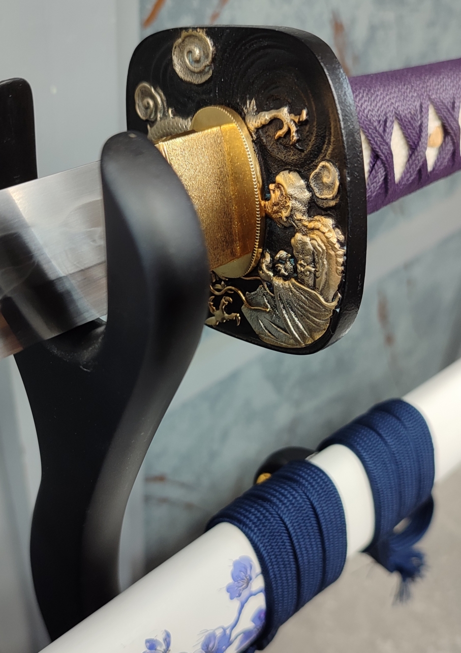 Tsuba: Tsuba je masivní, mosazný odlitek s detailním vyobrazením mořského draka a sedícího mnicha ve zlaté a tříbrné barvě. Seppy jsou vyrobeny také z mosazi, stejně jako habaki.