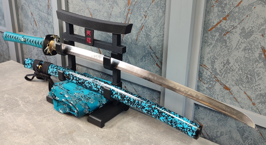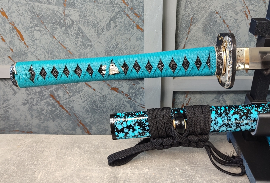 Saya: Pochva meče byla vyrobena ze dřeva a následně pokryta kombinací černého a tyrkysového laku. Nakonec byla celá saya přelakována několika desítkami vrstev lesklého, transparentního laku. Sageo z viskózy ve stylu Kakucho od Namikawa Heibei, vyrobená v Japonsku, je uvázána v klasickém stylu. Přibližně v jedné třetině byl umístěn Kaerizuno z rohu vodního buvola. Koiguchi bylo posíleno proti prasknutí saya.