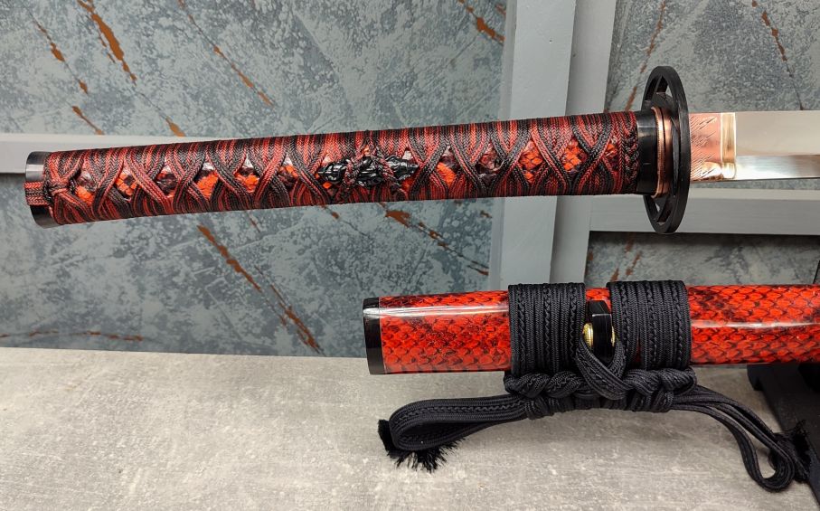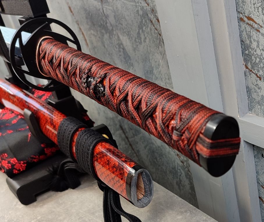 Tsuka: Rukojeť meče byla vyřezána ze dřeva a po stranách potažena stejnou hadí kůží, jako saya. Poté byla opletena jabaraito od Namikawa Heibei, barvenou do kombinace černé a mahagonové barvy. Následně byl oplet několikrá prolakován pro zvýšení jeho pevnosti. Fuchi a kashira jsou tvořeny rohem vodního buvola. Černě lakované menuki jsou mosazné odlitky ve tvaru sloupů, okolo kterých jsou obtočeni hadi. Čepel je v rukojeti zajištěna jedním bambusovým mekugi.