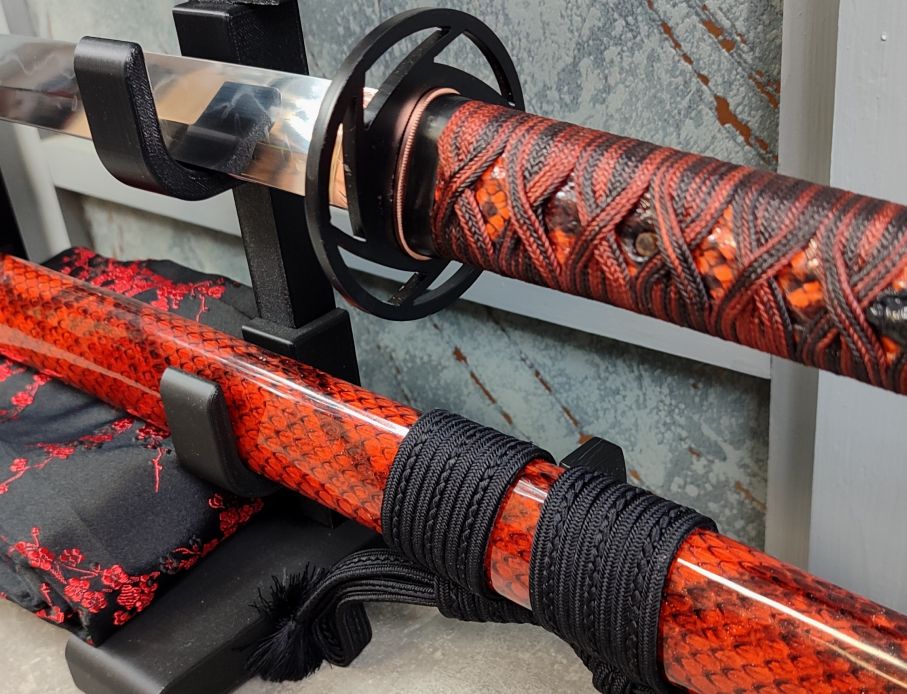 Saya: Saya ze dřeva červeného dubu byla potažena kůží z užovky tenkoocasé, mořené do barvy mahagonového dřeva. Poté byla pokryta několika vstvami tvrdého, transparentního laku, a následně osazena koiguchi, kojiri a kurigatou, z rohu vodního buvola. Na Saya byla uvázána černá sageo z Japonského hedvábí, z produkce Namikawa Heibei, ve stylu Nakafuji. Přibližně v jedné třetina byl na pochvu přídán háček Kaerizuno, opět z rohu vodního buvola.