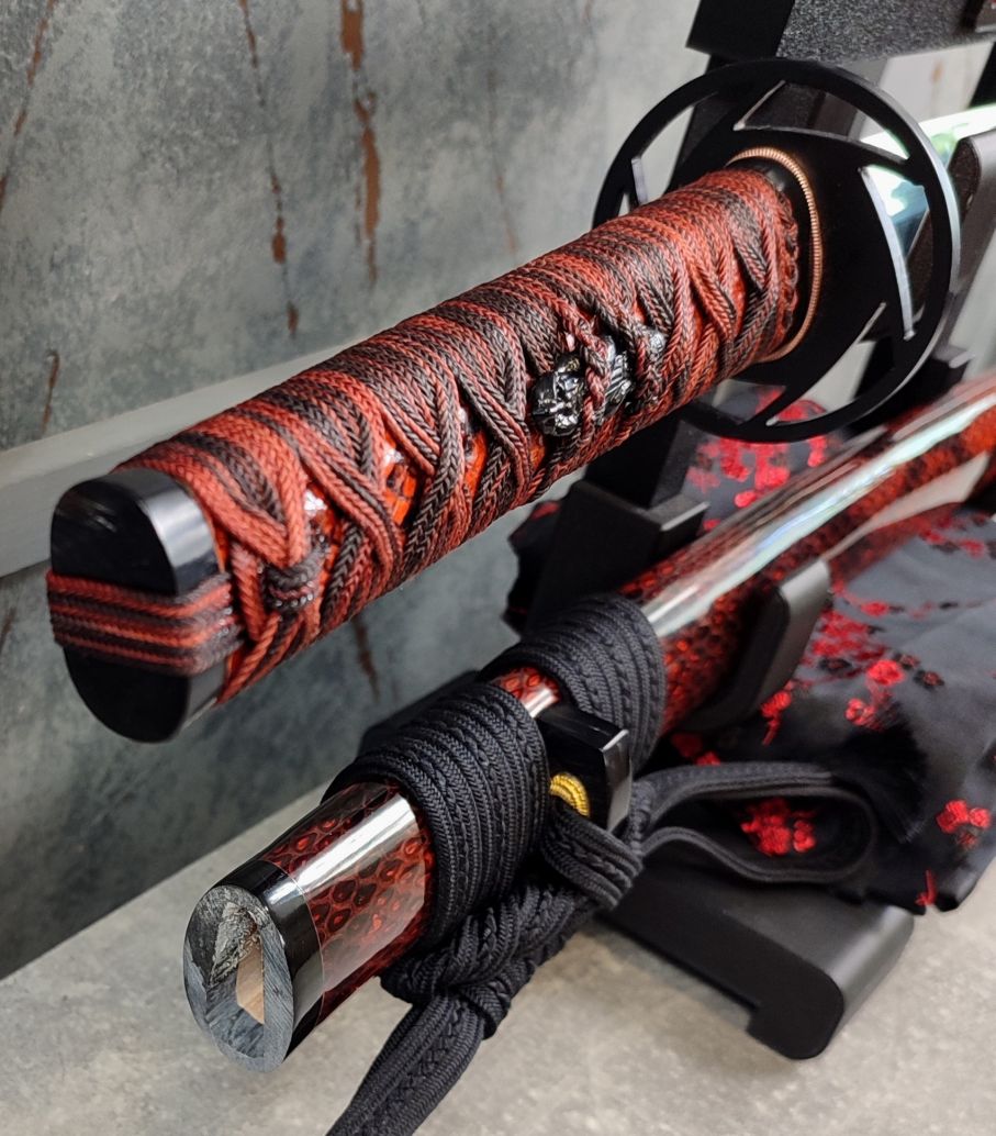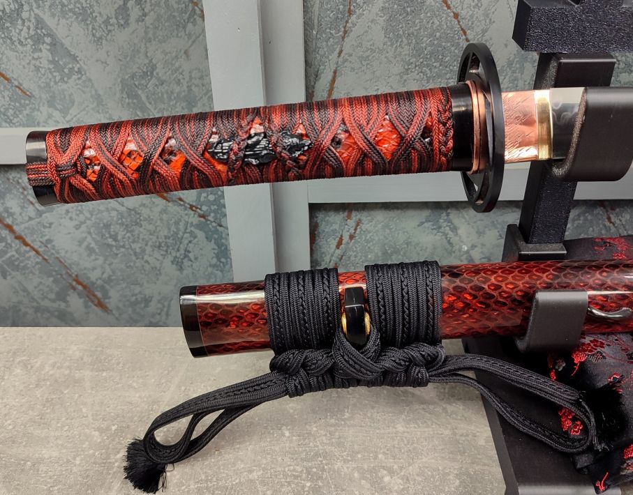 Tsuka: Rukojeť meče byla vyřezána ze dřeva a po stranách potažena stejnou hadí kůží, jako saya. Poté byla opletena jabaraito od Namikawa Heibei, barvenou do kombinace černé a mahagonové barvy. Následně byl oplet několikrá prolakován pro zvýšení jeho pevnosti. Fuchi a kashira jsou tvořeny rohem vodního buvola. Černě lakované menuki jsou mosazné odlitky ve tvaru sloupů, okolo kterých jsou obtočeni hadi. Čepel je v rukojeti zajištěna jedním bambusovým mekugi.