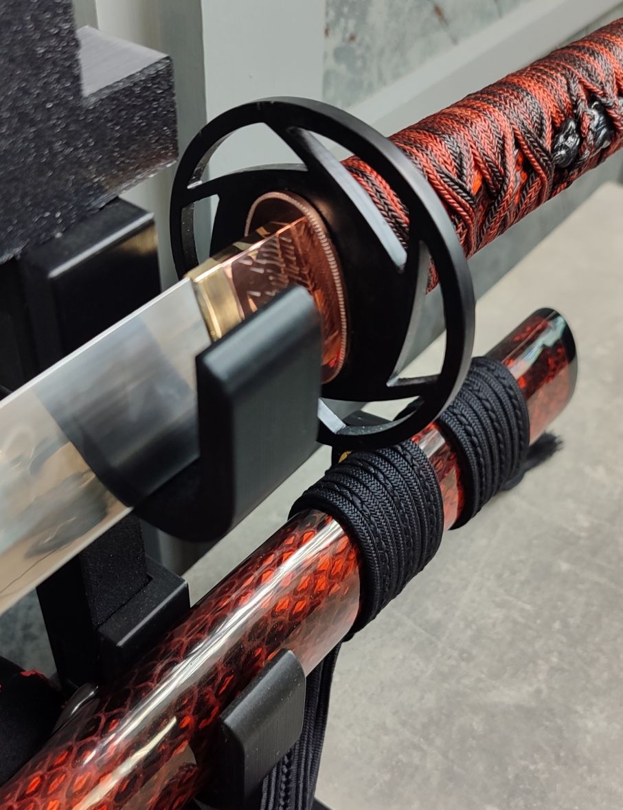 Tsuba: Záštita byla vyrobena z černě lakované oceli ve stylu sukashi. Dvojité seppy jsou měděné a ručně doleštěné, stejně jako dvojitý habaki z kombinace mědi a mosazi.